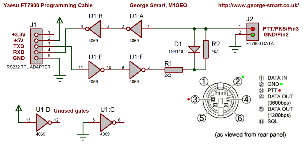 1. Первое, что требуется для перепрошивки трансивера, это кабель-программатор. Нашел в интернете несколько вариантов схем – самой подходящей оказалась схема на базе преобразователя USB–UART, поскольку железного COM порта у меня на ноутбуке нет, а USB хоть отбавляй (несмотря на то, что на схеме указана модель FT-7900, он вполне подходит и для FT-8000).