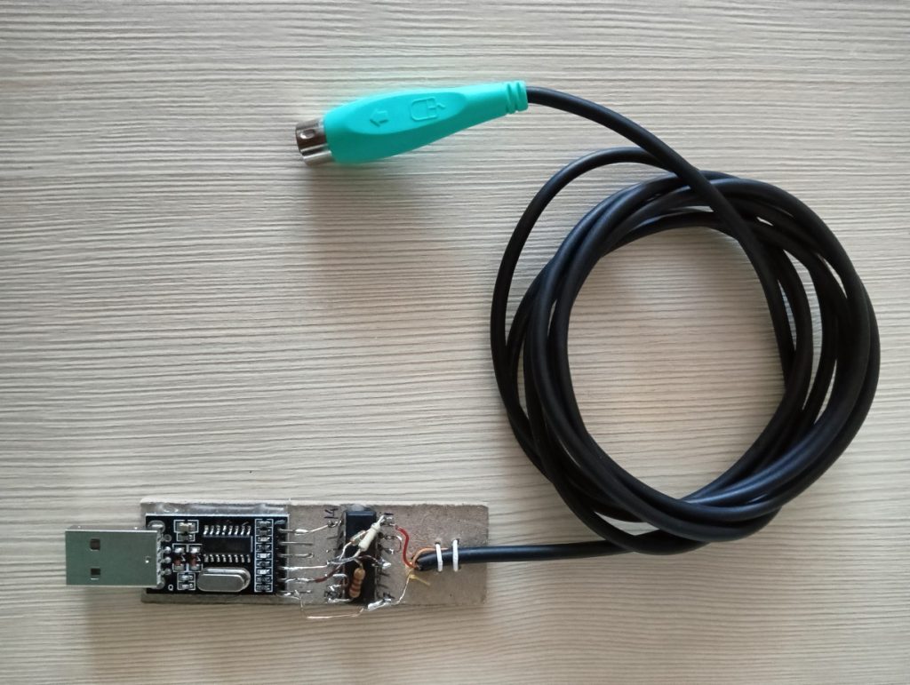 Преобразователь USB – UART взят самый что ни на есть ходовой и дешевый на чипе CH 340. Микросхема логики CD 4069, кабель взят от старой мышки с разъемом PS /2. Получилась такая конструкция.
